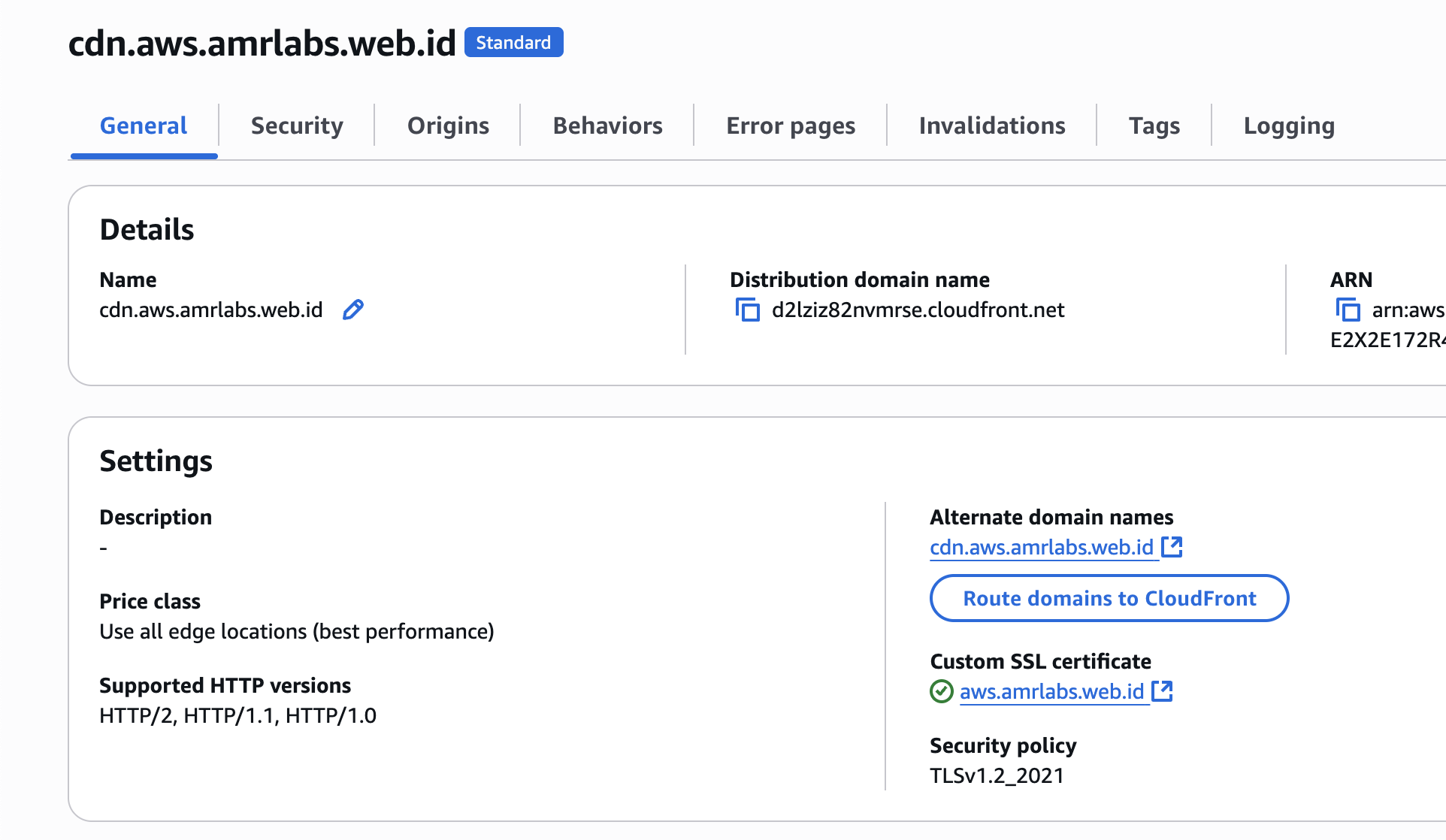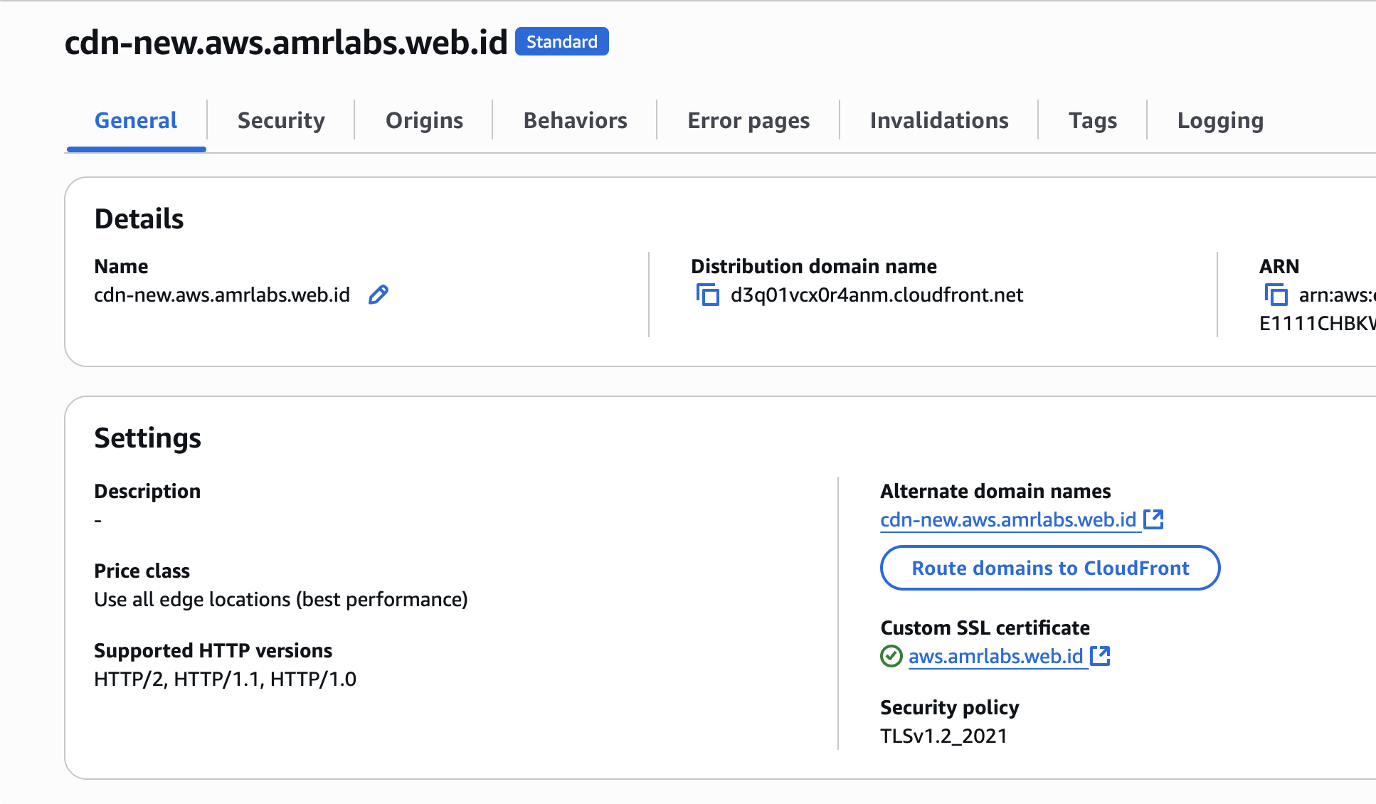 Why this works: This clever trick means the new CloudFront distribution only ever sees requests for cdn-new.aws.amrlabs.web.id. We only needed to add that domain as its Alternate Domain Names, completely avoiding the conflict with the old distribution.